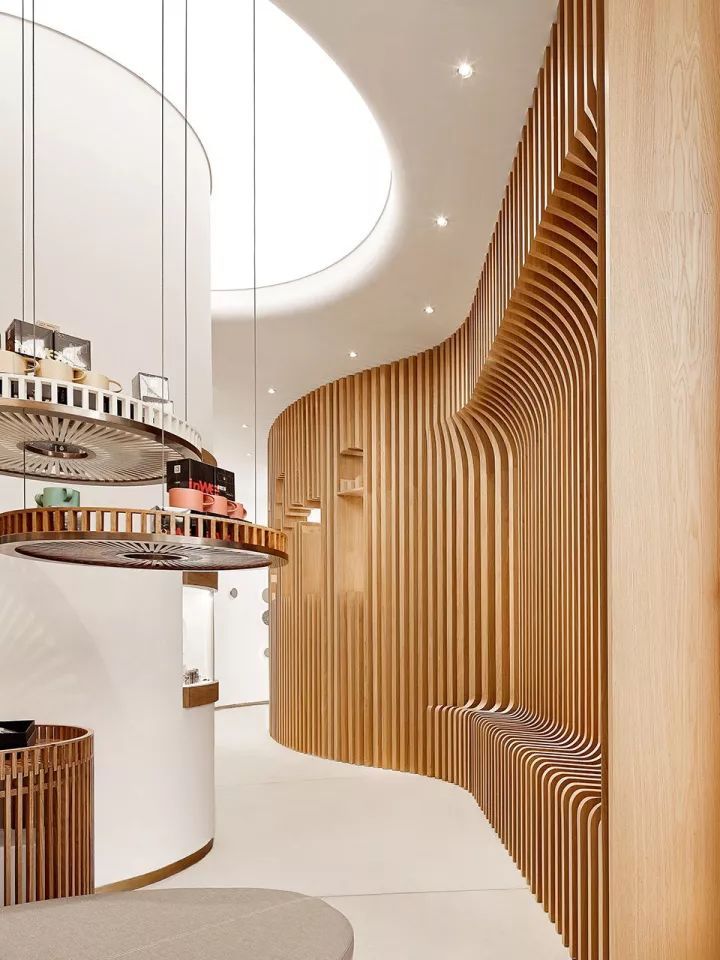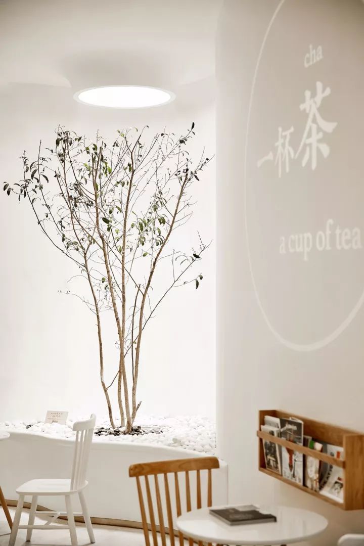 这家店以茶为核心,色调上以纯粹的白色和原木色为主,各式条纹木形贯穿其中,通有曲直之性和生机之源。