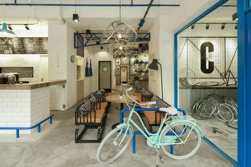 店里很多精心设计的细节,比如把自行车的车座当成座位;车铃作为点单铃;自行车轮胎做成的酷吊灯……