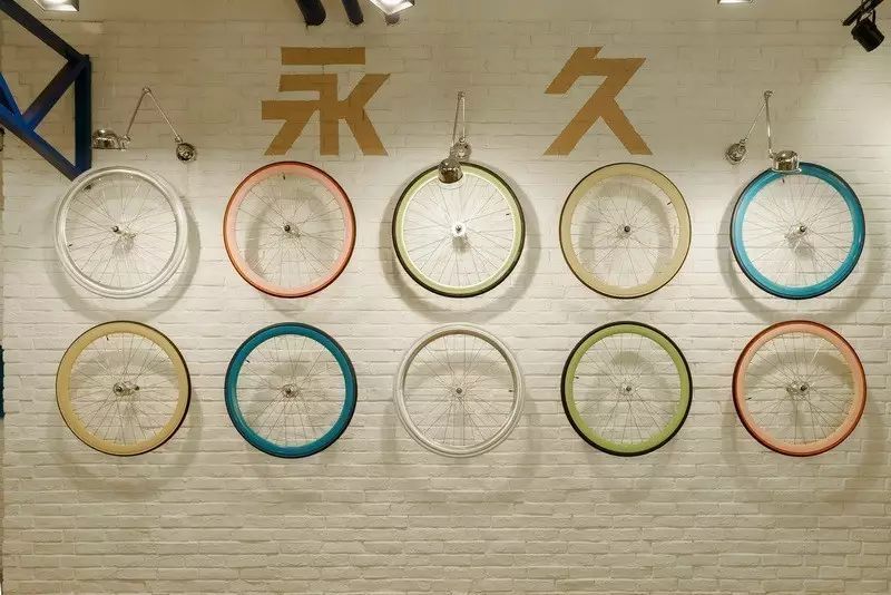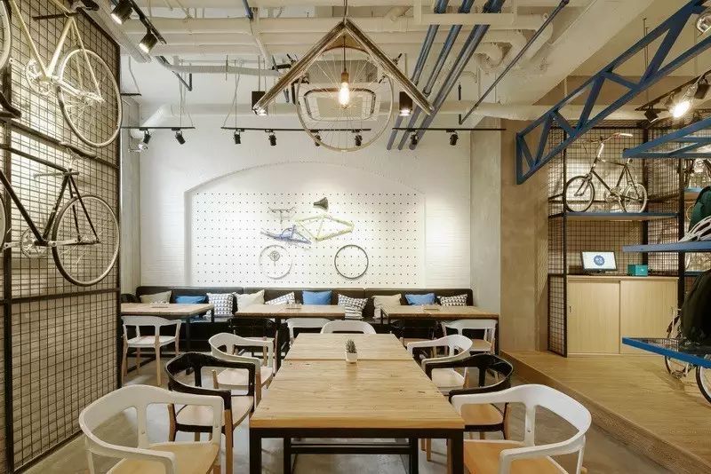 不久前它又开了一家新店,这家店是敞开式的空间,同样各式经典的自行车元素随处可见。虽然在设计上依旧将复古进行到底,但相对于第一家店明显进行了升级,更活泼时尚了。