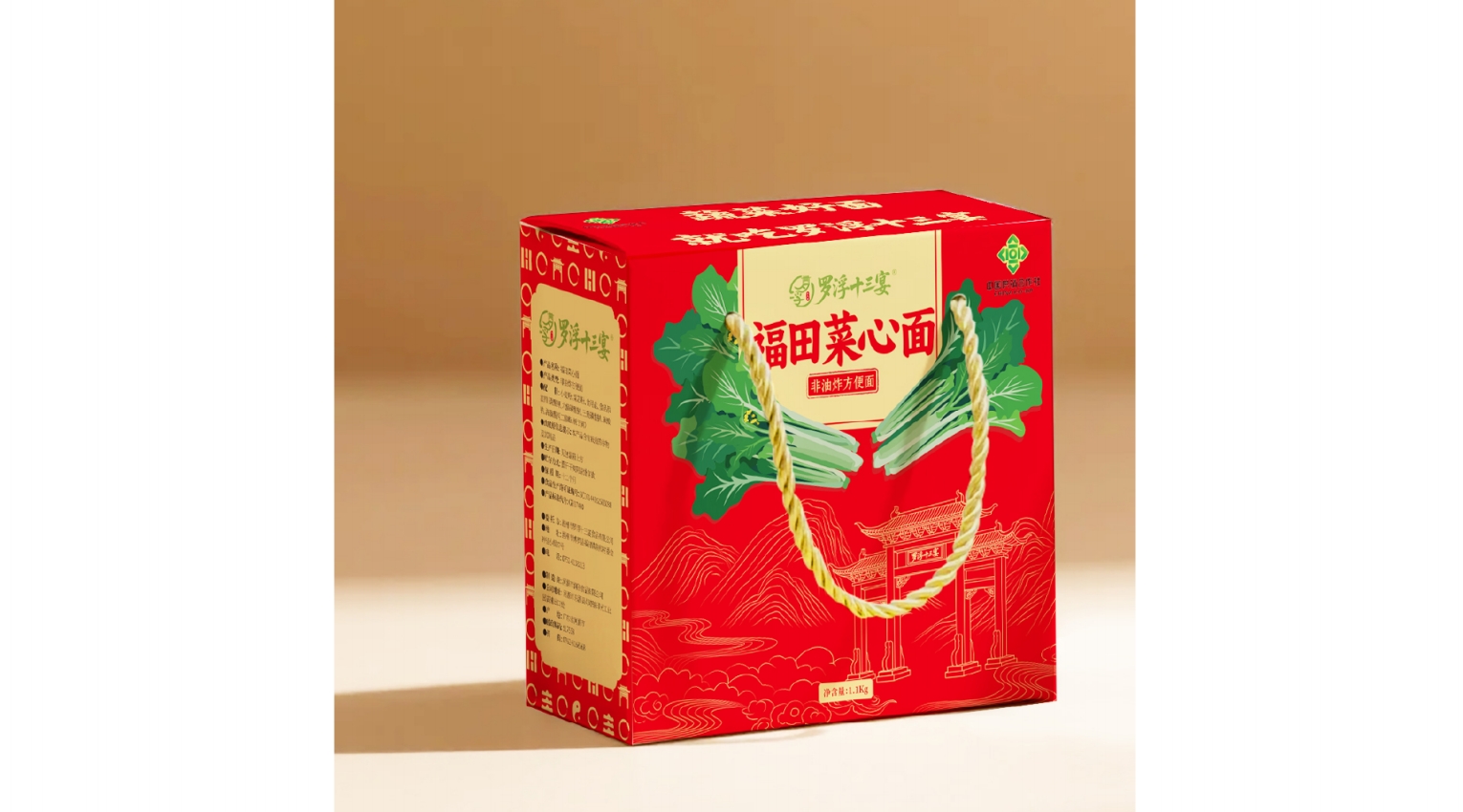 核心视觉符号:大面积菜心插画(绿色)与红色背景形成强烈对比,直观传递“蔬菜面”的产品特性,降低消费者认知成本;罗浮山门楼剪影强化地域文化符号,与“罗浮十三宴”品牌名形成呼应,增强文化信任感。